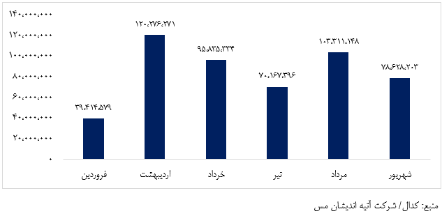 در نمودار زیر روند فروش ماهانه کاتد مس در شش ماهه نخست 1403 آورده شده است. سیاست شرکت در سال جاری افزایش تولید محصولات نهایی نظیر مفتول مس بوده که بخشی از فروش را به خود اختصاص داده است. مقدار فروش مفتول معادل 61 درصد افزایش داشته است.